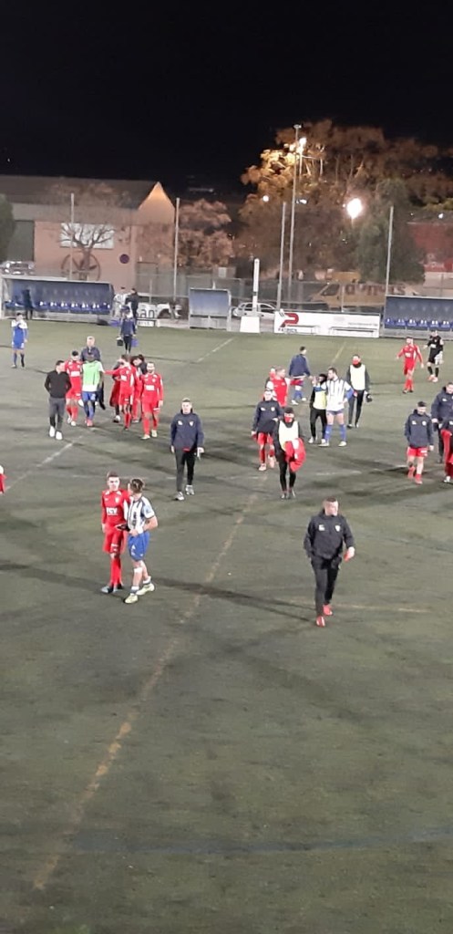 Pese al gol de penalti que adelantaba al conjunto visitante, el Santfeliuenc intentaba buscar el empate con centros a Sani sin precisión y con jugadas a balón parado que no lograban superar la portería de Ortega.