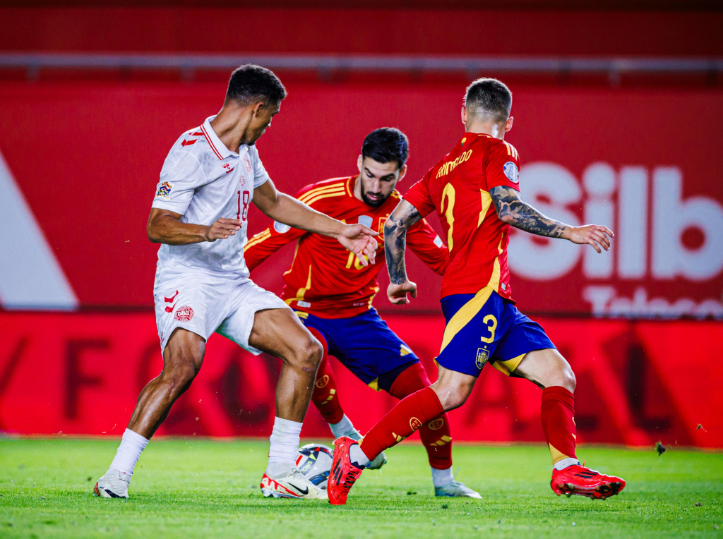 España comenzó el encuentro buscando su sitio, encontrándose a sí misma, y es que los daneses, no se lo pusieron nada fácil. Su defensa en bloque y la idea de cerrar los espacios fue clara y así se lo plantearon a la roja. El conjunto visitante en los primeros minutos gozó de una llegada pero que con una gran mano, David Raya acabó deteniendo el disparo.