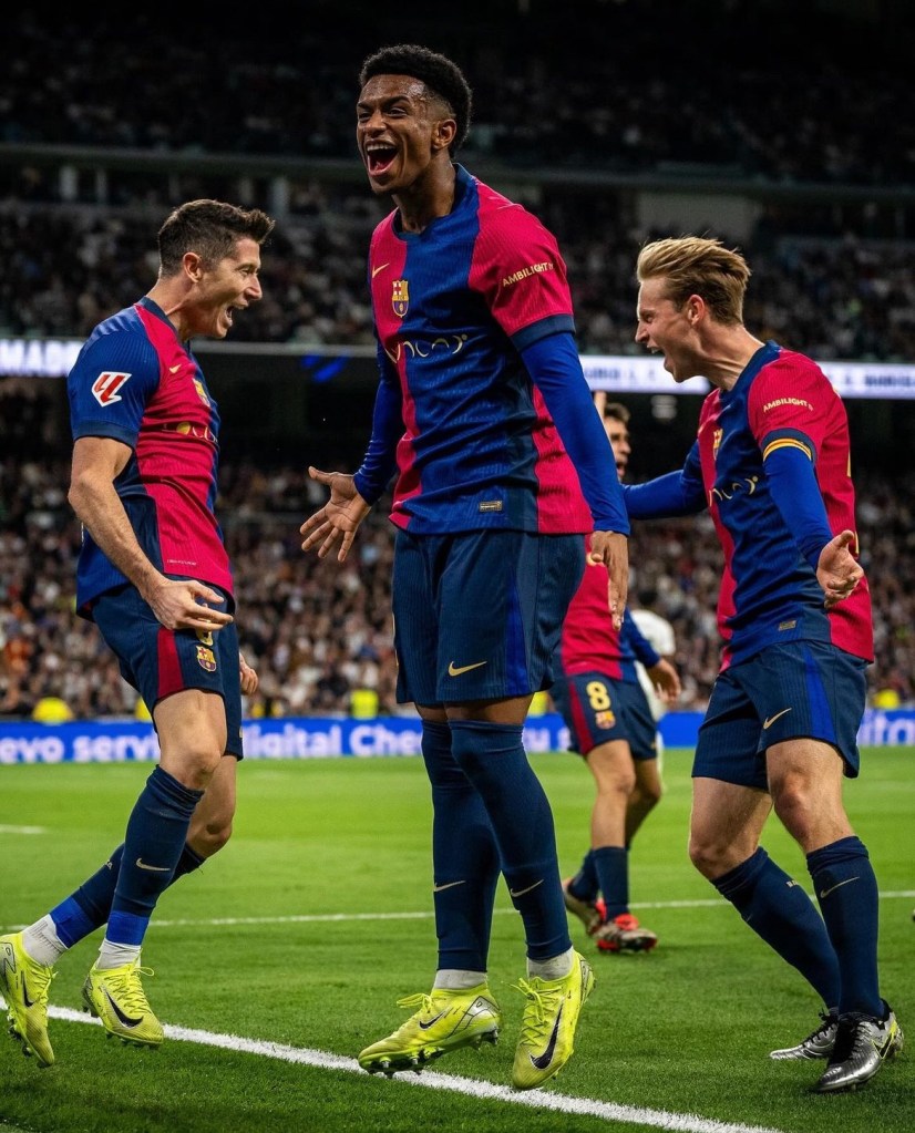 El 0-3 llegó al minuto 77, cuando Lamine Yamal firmó su primer gol en un Clásico con un preciso tiro cruzado que dejó sin opciones al portero rival. El joven jugador celebró emocionado mientras los aficionados azulgranas aplaudían su histórica anotación. Raphinha amplió aún más la ventaja con el 0-4 poco después, consolidando una victoria contundente y dejando claro el dominio del Barça.