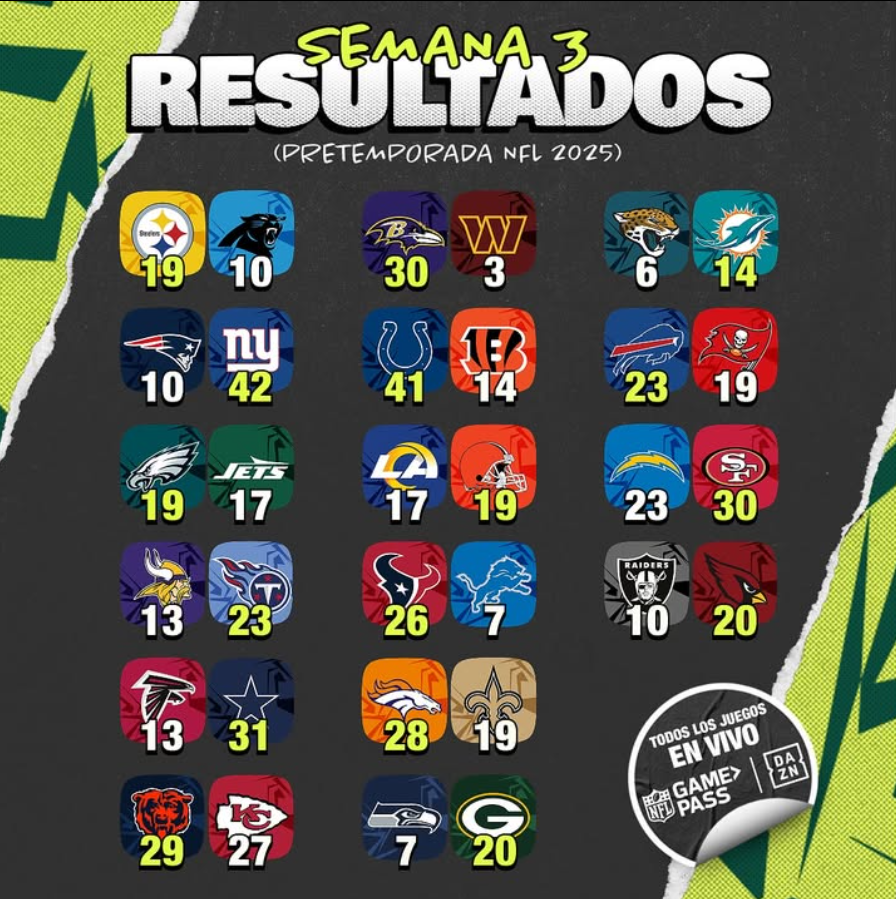 La Semana 3, en definitiva, dejó una mezcla de certezas y advertencias: novatos como Dart y Loop llegan encendidos; Sanders y los Commanders generan dudas; y equipos como Bears, Giants y Bengals terminan la pretemporada con señales claras de hacia dónde van. Ahora, con los rosters a punto de reducirse a 53 jugadores, todo queda listo para el verdadero inicio: el kickoff del 4 de septiembre.