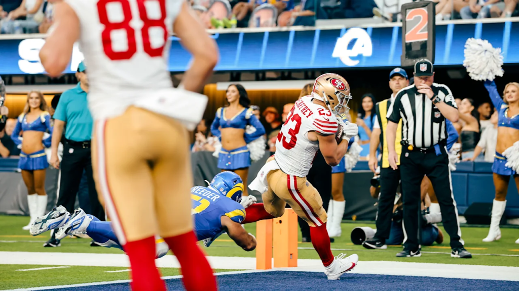 La acción comenzó el jueves con un auténtico partidazo divisional. Los San Francisco 49ers se impusieron 26–23 a los Los Angeles Rams en un duelo que necesitó tiempo extra para resolverse. El conjunto de Kyle Shanahan, pese a las bajas de nombres clave como Brock Purdy o George Kittle, resistió gracias a su defensa y a la sangre fría en el cierre. La jugada decisiva llegó con una parada monumental en cuarta y una en la yarda 11, evitando la remontada angelina.