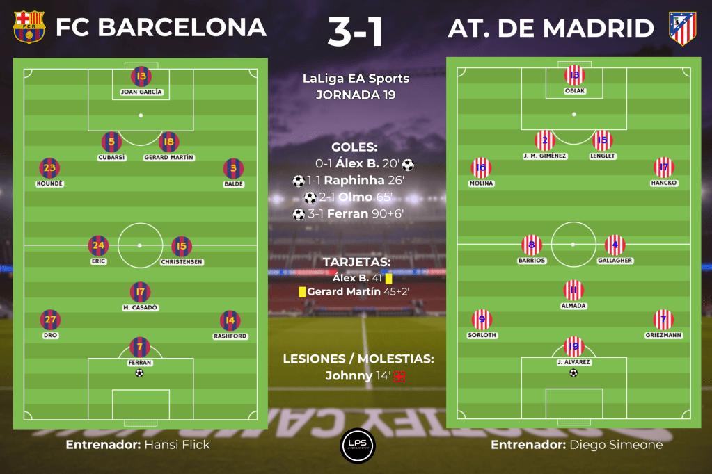 FC Barcelona y Atlético de Madrid se enfrentaban en esta avanzada 19ª jornada de LaLiga EA Sports con el objetivo común de conseguir los 3 puntos. El partido, se adelantaba en fechas con motivo de la disputa de la Supercopa de España en Arabia del próximo mes de enero.