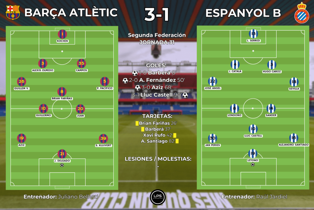 Barça Atlètic y Espanyol B se enfrentaban en esta 31ª Jornada de Segunda Federación con el objetivo común de conseguir los 3 puntos que les permitiría seguir en la lucha por los puestos de playoff de ascenso a Primera RFEF.