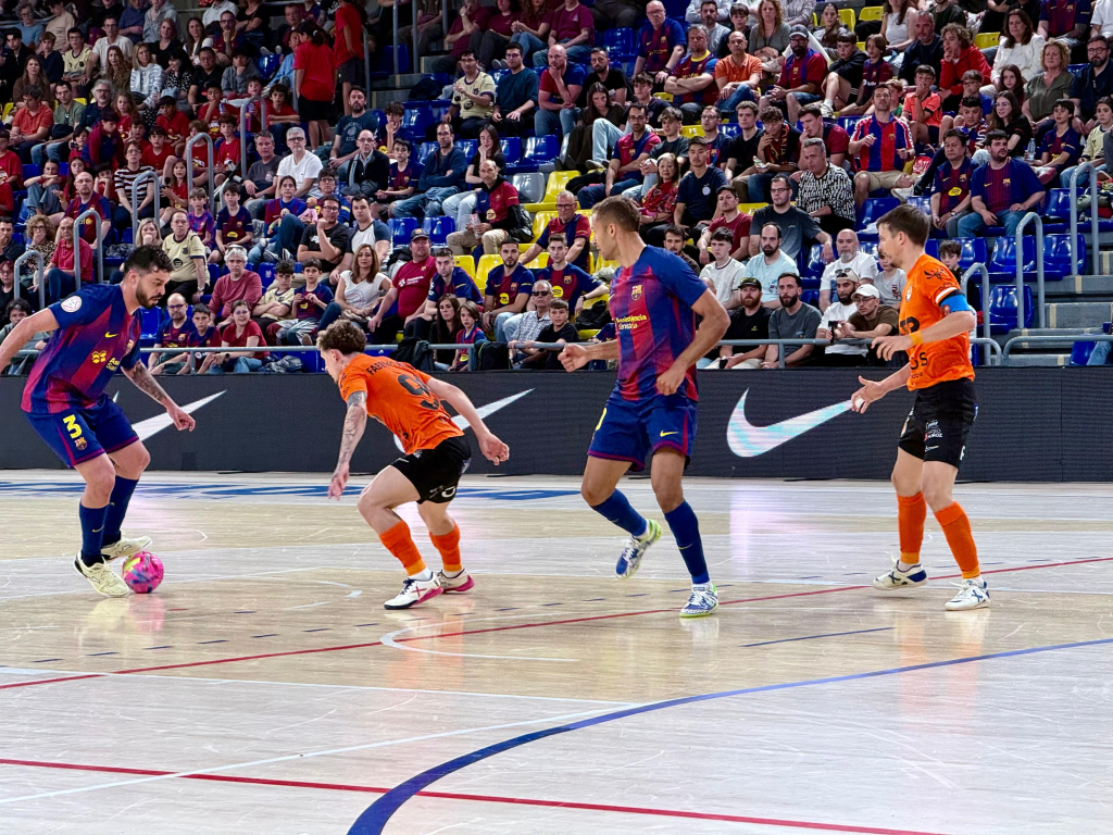 El conjunto azulgrana dominaba la posesión, presionaba alto y acumulaba llegadas, incluso rozando el segundo tanto con acciones claras que evidenciaban la diferencia sobre el Ribera Navarra FS.